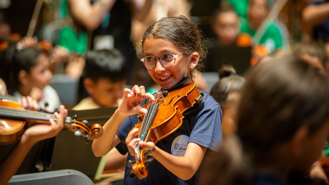 Lors de chaque cycle et pendant 3 ans, des enfants de 7 à 12 ans issus de quartiers prioritaires ont l’opportunité d’apprendre un instrument et de jouer en orchestre grâce à l’accompagnement de l’Auditorium-Orchestre national de Lyon. Depuis janvier 2025, la 3e édition bat son plein : 160 enfants bénéficient de cours de musique chaque semaine et se regroupent tous les deux mois sous la baguette de Rémi Durupt, chef d’orchestre professionnel, afin de préparer un grand concert de fin de saison.